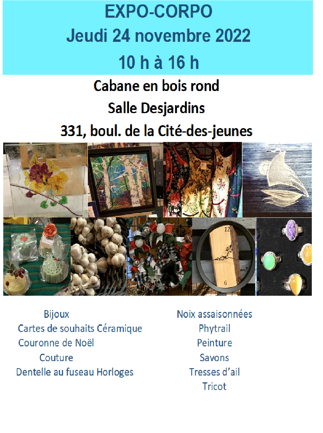 *Jeudi le 24 novembre EXPO-CORPO de 10 h à 16 h Salle Desjardins.